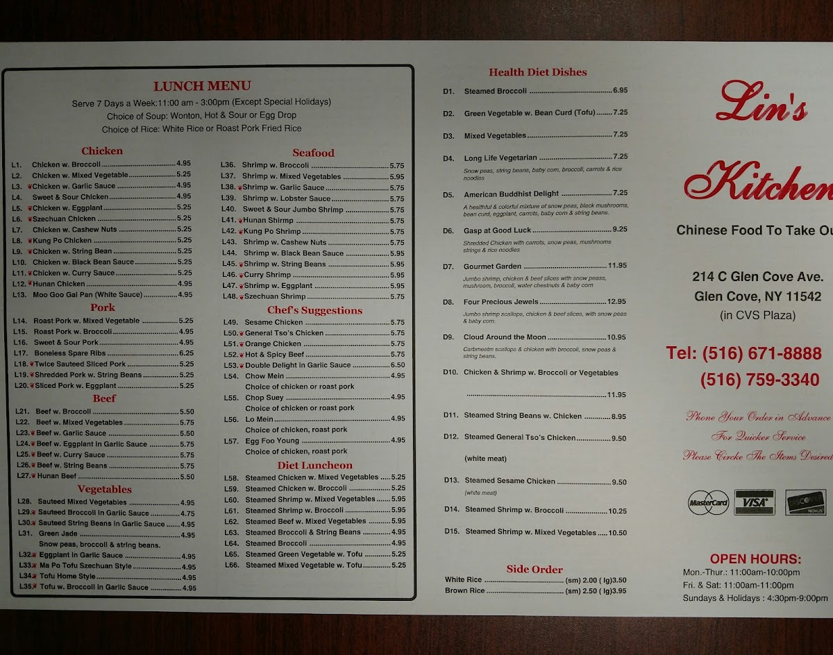 If you’re in the mood for a flavorful adventure, Lin 's Menu is where your taste buds get to roam freely. From sizzling stir-fries to tender dim sum, every dish feels thoughtfully crafted, balancing authentic flavors with a touch of creativity. You’ll notice how fresh ingredients shine through, whether it’s the crisp veggies in a noodle bowl or the perfectly marinated meats that practically melt in your mouth. The variety is impressive too-there’s something for everyone, from light bites to hearty mains that satisfy without overwhelming. Pairing a savory entrée with one of their signature sauces or dipping treats adds that extra layer of fun, making every bite feel intentional and exciting. And while the menu keeps traditional favorites in the spotlight, there are subtle surprises tucked in that might just become your new go-to orders. Walking through it feels less like choosing food and more like exploring a collection of little culinary stories, each plate inviting you to take a moment, savor, and enjoy the rhythm of flavors at 214 Glen Cove Ave Suite C, Glen Cove, NY.